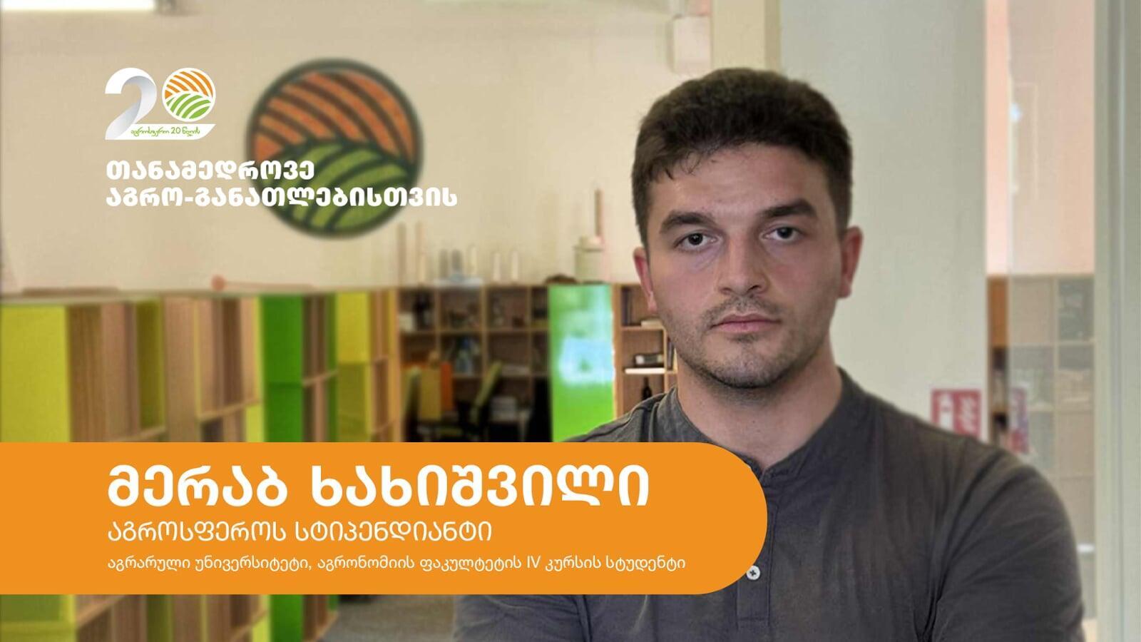 კომპანია "აგროსფერომ" წელს სტიპენდია აგრარული უნივერსიტეტის მაღალი მოსწრების 6 სტუდენტს დაუნიშნა. მათ შორის ერთ-ერთი აგრონომიის პროგრამის სტუდენტი მერაბ ხახიშვილია.